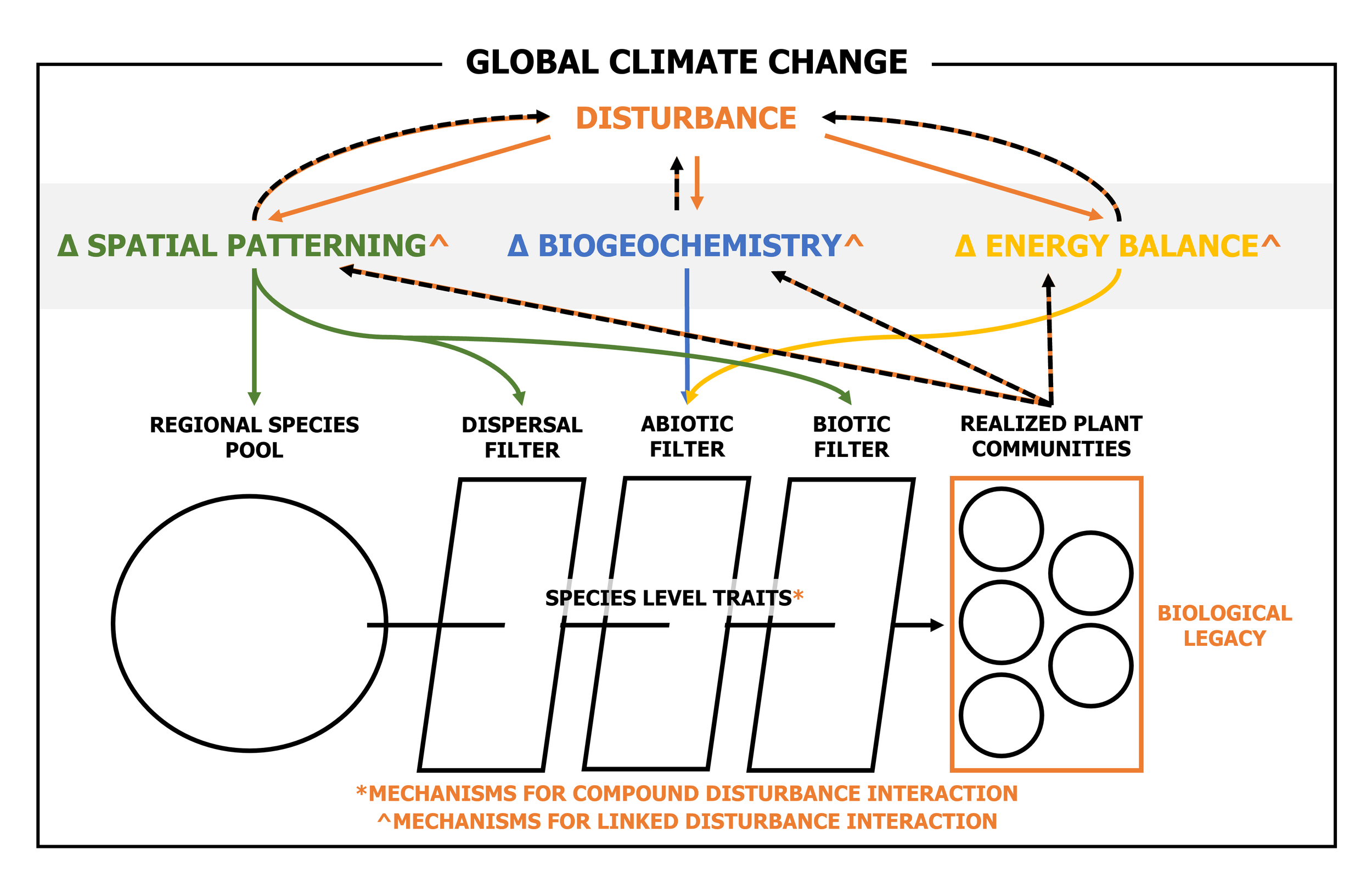 I am interested in understanding the patterns and processes of disturbance in forested ecosystems. Specifically, my research program aims to disentangle how disturbances in forested ecosystems, such as fires or insect outbreaks (1) modify local plant communities, (2) interact with subsequent disturbances, and (3) the consequences these modifications and interactions have for forest conservation and management. Importantly, all of these processes occur in the context of global climate change which can directly and indirectly modify both disturbances and forest ecosystems. Understanding the causes and consequences of forest disturbance requires investigations that span spatial and temporal scales. To address my interests, I use a variety of methods such as field surveys, statistical models, geographic information systems, and mathematical and theoretical frameworks. My ultimate goal is to conduct research that is relevant both in theory and for management application.